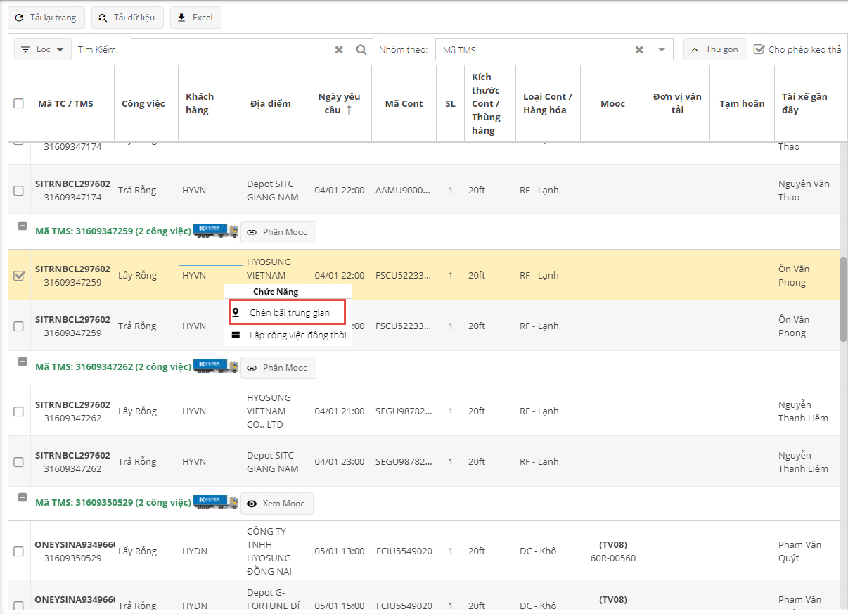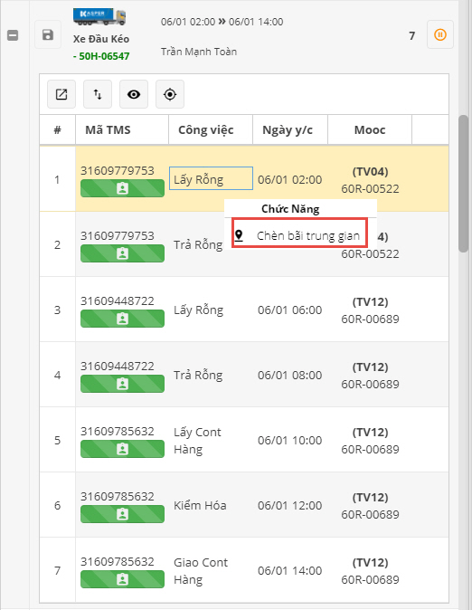 Nhấn nút chuột phải công việc có vận đơn cần thực hiện chèn bãi trung gian, chọn chức năng Chèn bãi trung gian như 2 hình trên.