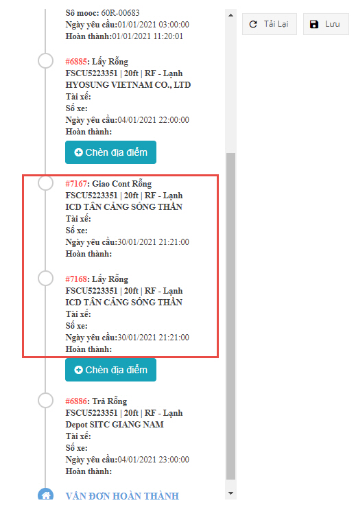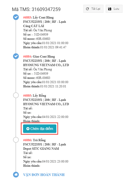 Nhấn nút Chèn địa điểm ở giữa hai công việc phát sinh bãi trung gian và kết quả như sau:
