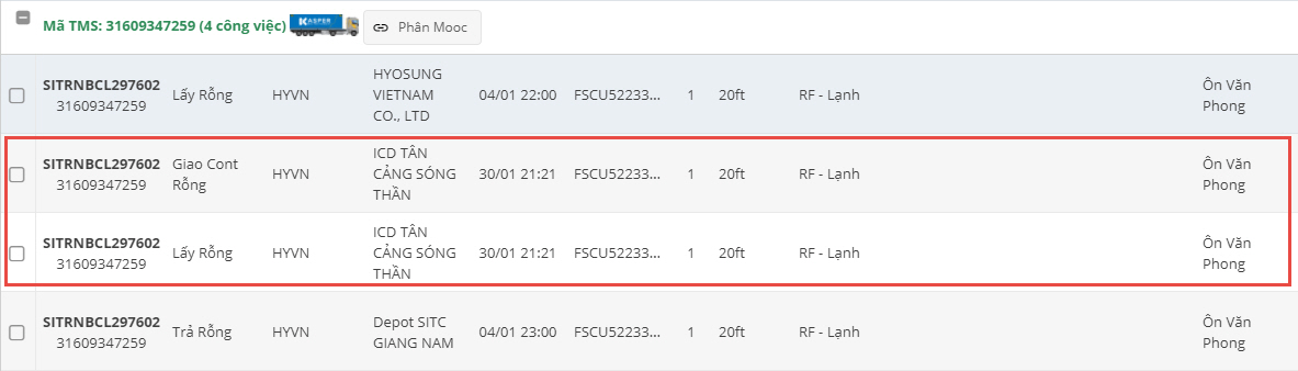 Trong màn hình danh sách công việc chưa phân công hoặc danh sách công việc của một chuyến: