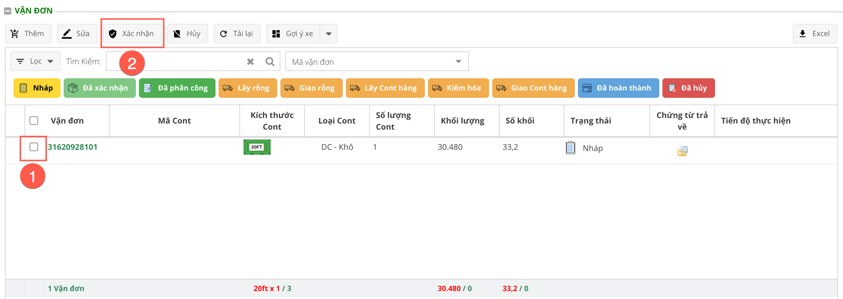 - (2): Bấm nút Xác nhận để xác nhận vận đơn.