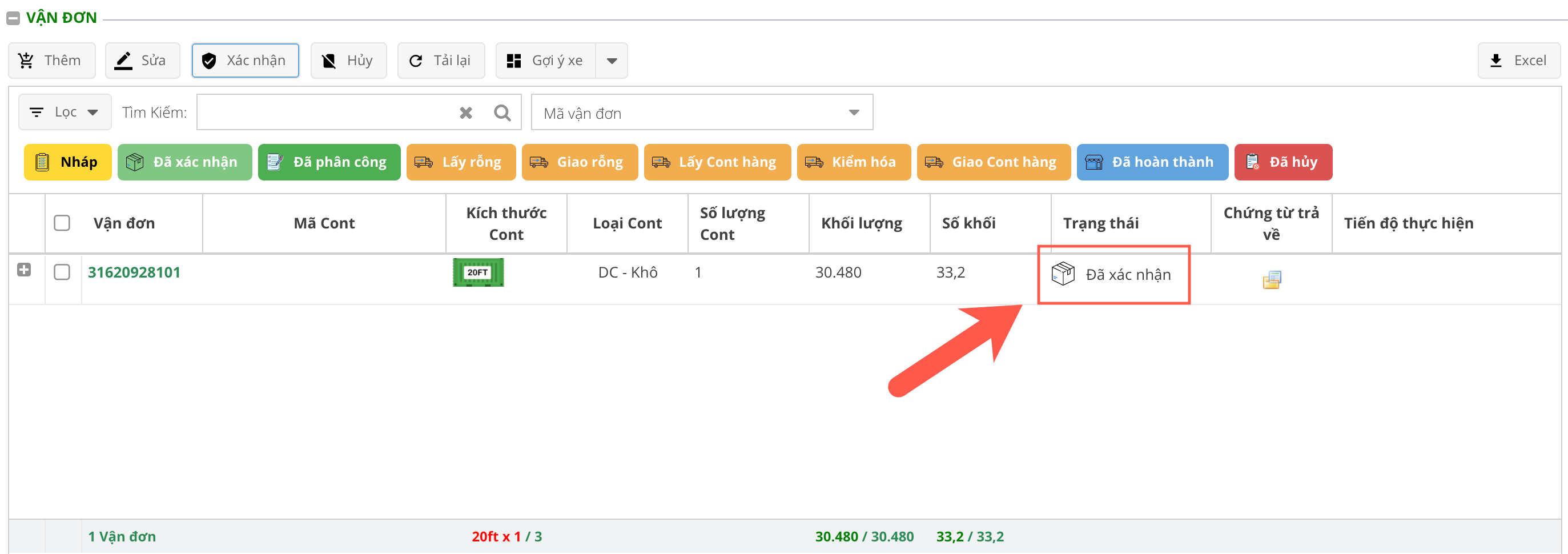 - Vận đơn từ trạng thái Nháp ban đầu chuyển sang trạng thái Đã xác nhận.