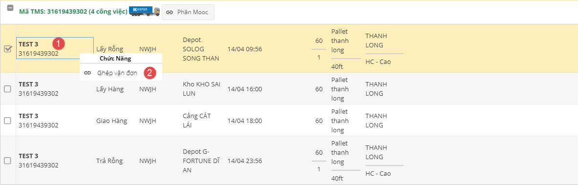 - (1): Chuột phải bất kỳ công việc nào của vận đơn nội địa cần ghép.