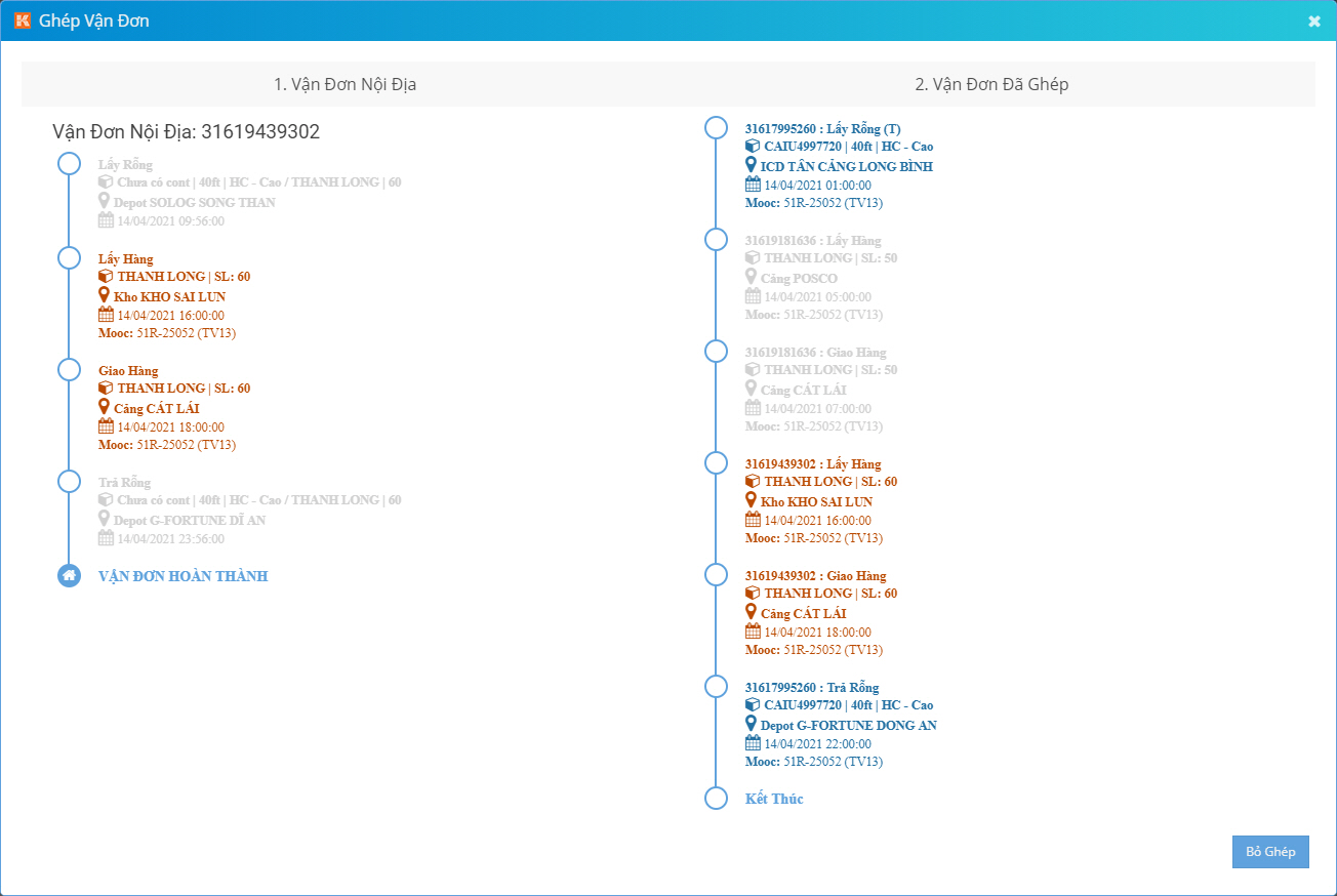 - (2): Danh sách các vận đơn EXPFCL và IMPFCL có chiều rỗng phù hợp. Thời gian lấy hàng và giao hàng của đơn nội địa phải nằm trong khung thời gian chiều rỗng của vận đơn EXPFCL và IMPFCL, cùng kích thước cont và cùng loại cont.