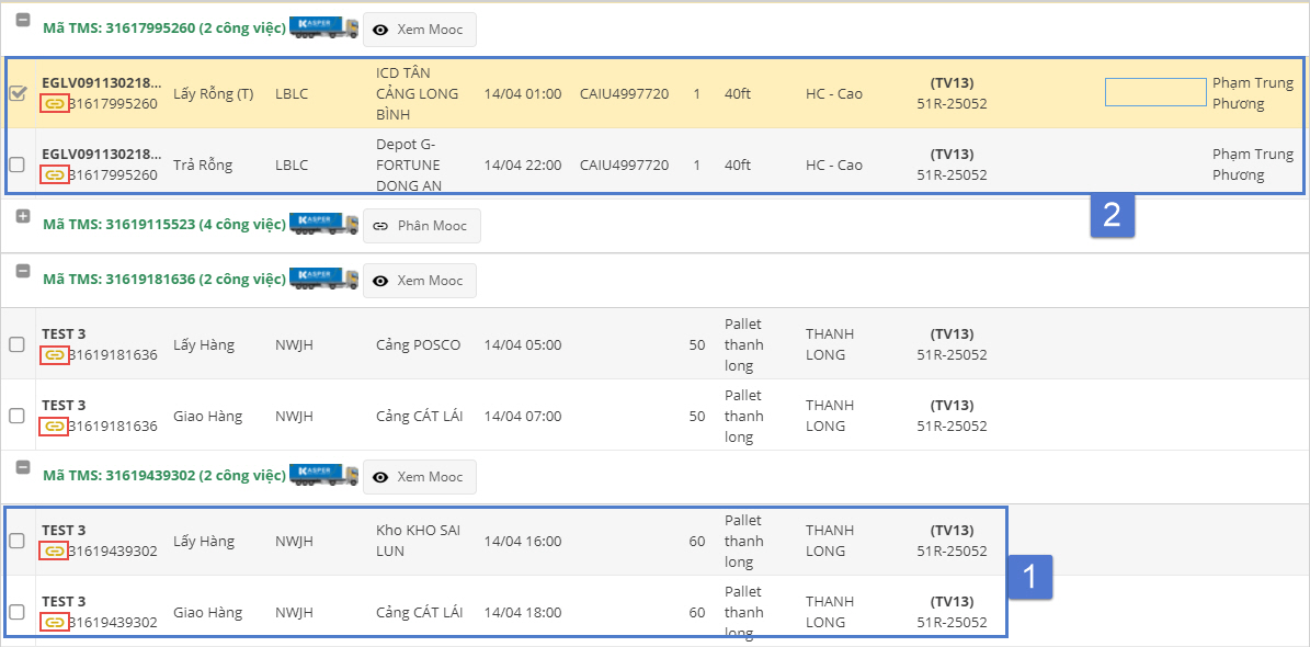 - (1): Check vào vận đơn phù hợp → Thông tin lộ trình sau khi ghép sẽ được hiển ra. Trong trường hợp vận đơn EXPFCL hoặc IMPFCL chưa phân Mooc, sau khi check vào vận đơn sẽ nhận được thông báo Vận đơn chưa được phân Mooc.