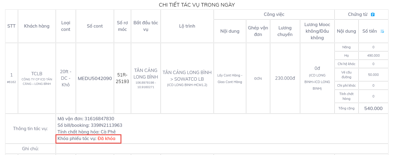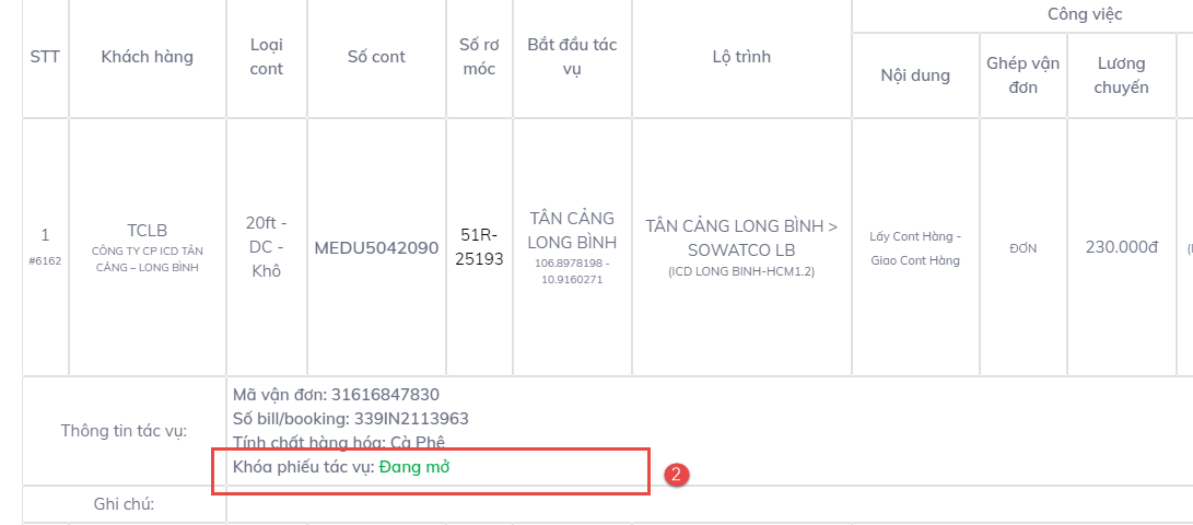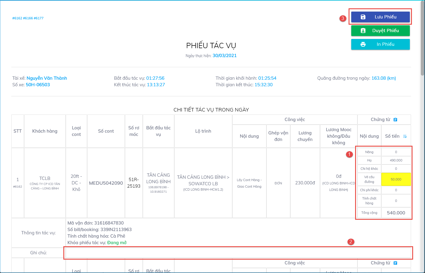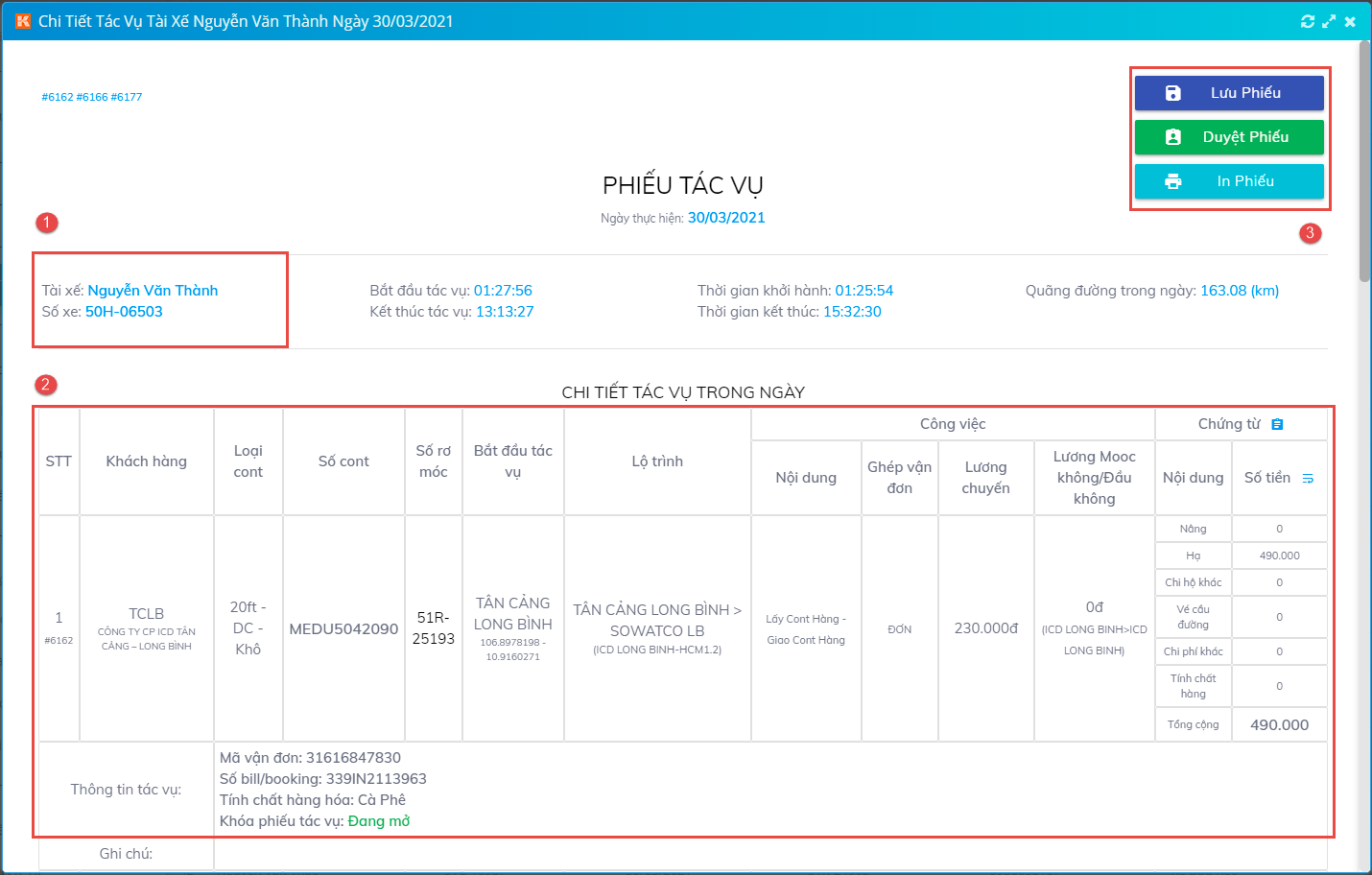 - (1): Thông tin tài xế và phương tiện cua phiếu tác vụ