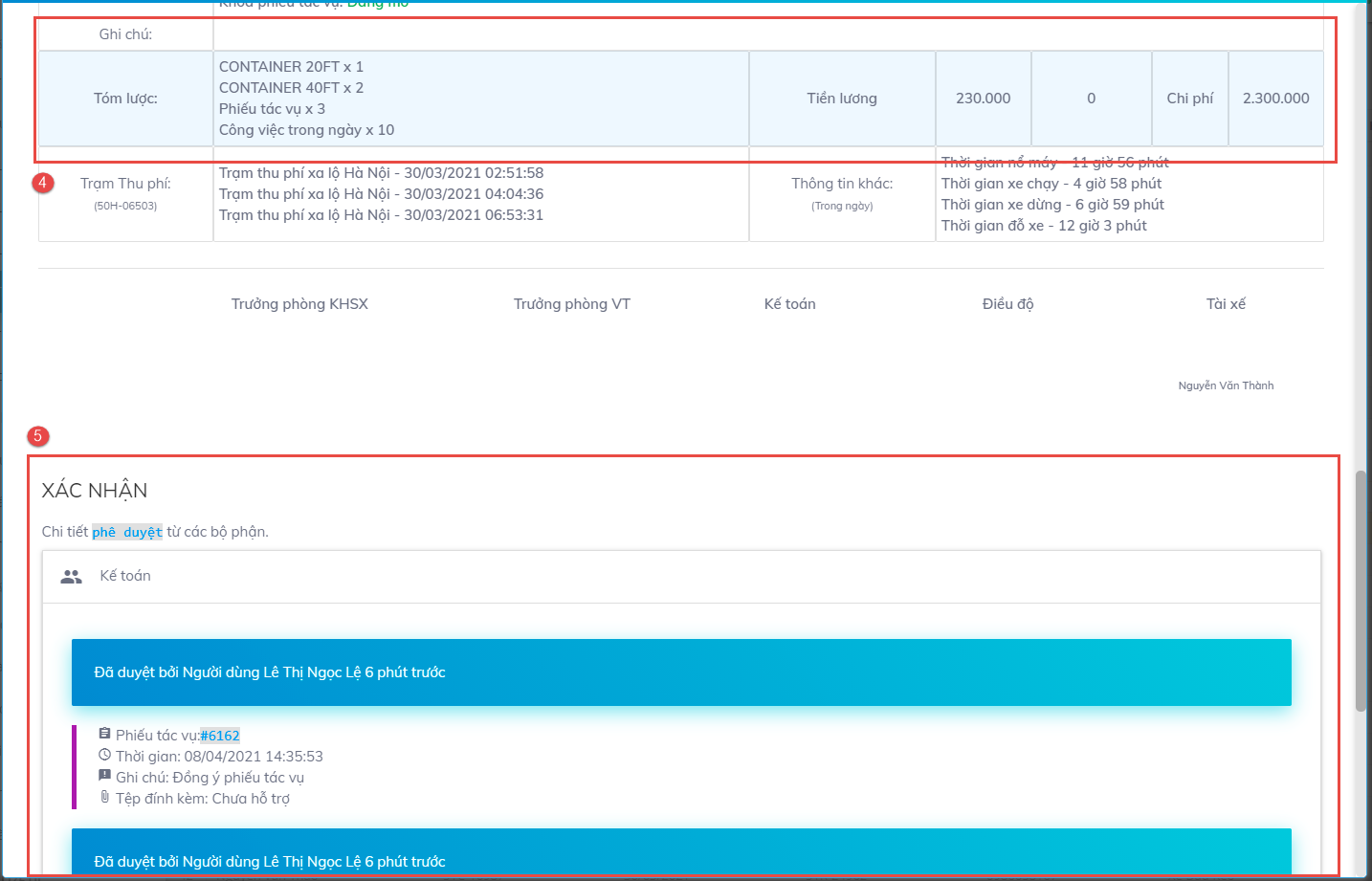 - (5): Nhấn chọn Xác nhận nếu bạn đồng ý phê duyệt với danh sách phiếu tác vụ