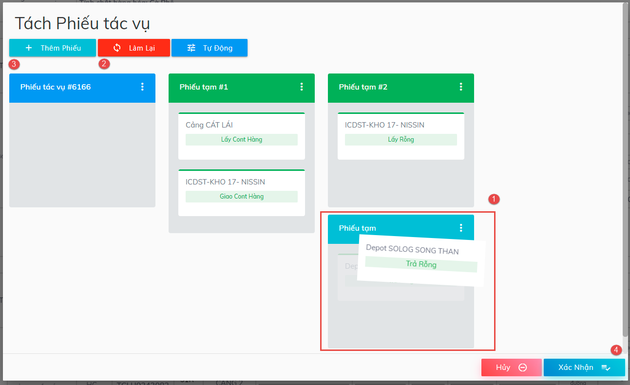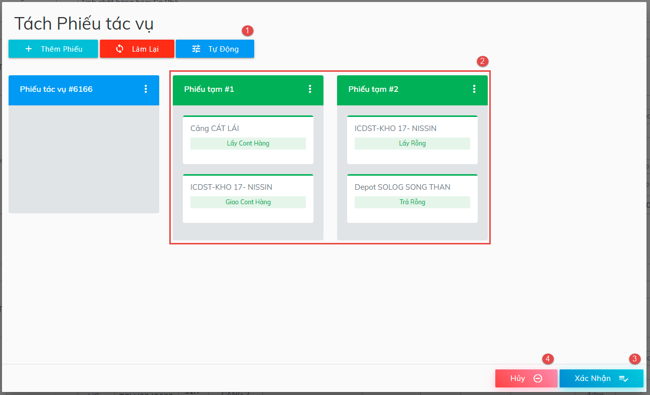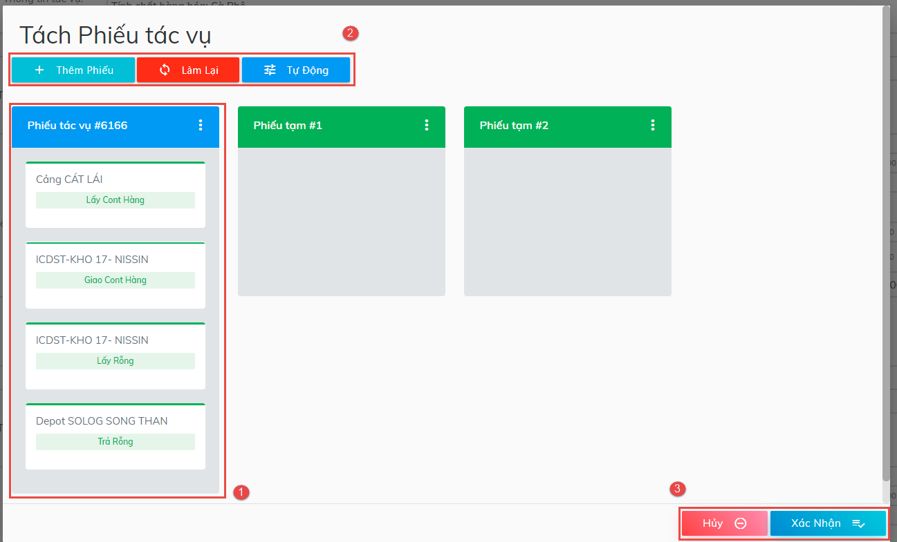 - (2): Danh sách tác vụ sau khi tách thành các phiếu khác nhau