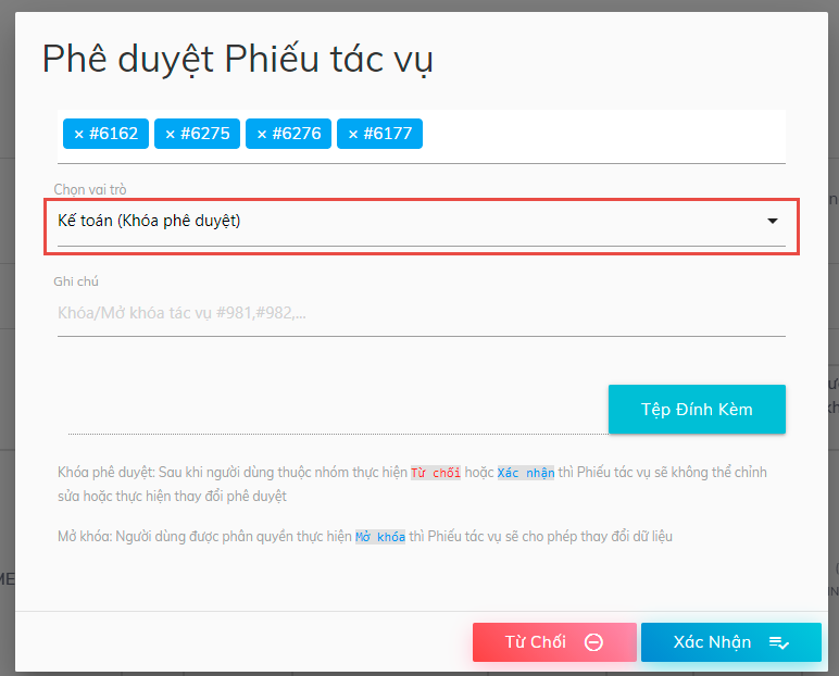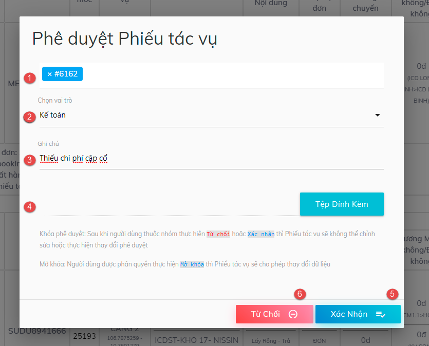 - (6): Nhấn chọn Từ chối nếu bạn từ chối phê duyệt với danh sách phiếu tác vụ