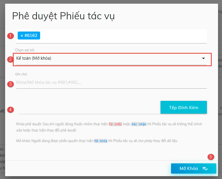 - (1): Danh sách phiếu tác vụ tương ứng cần mở khóa