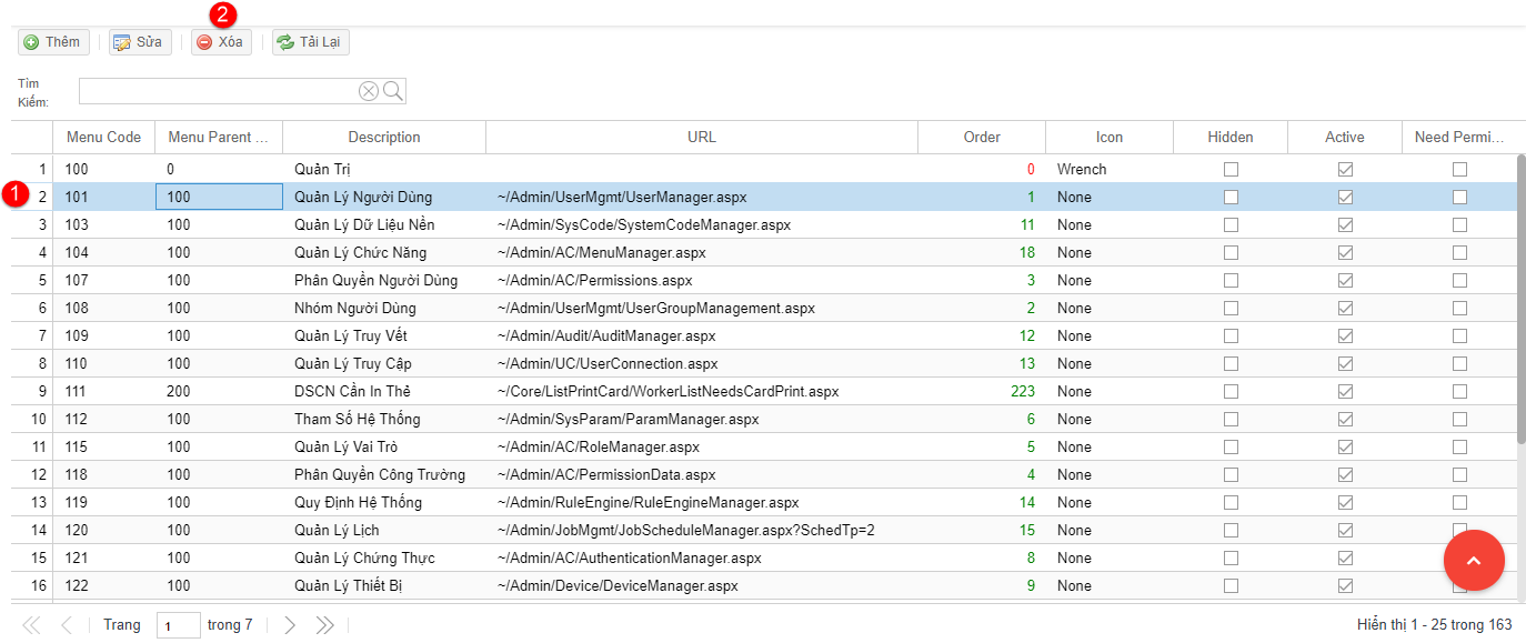- (1): Chọn chức năng muốn xóa khỏi hệ thống