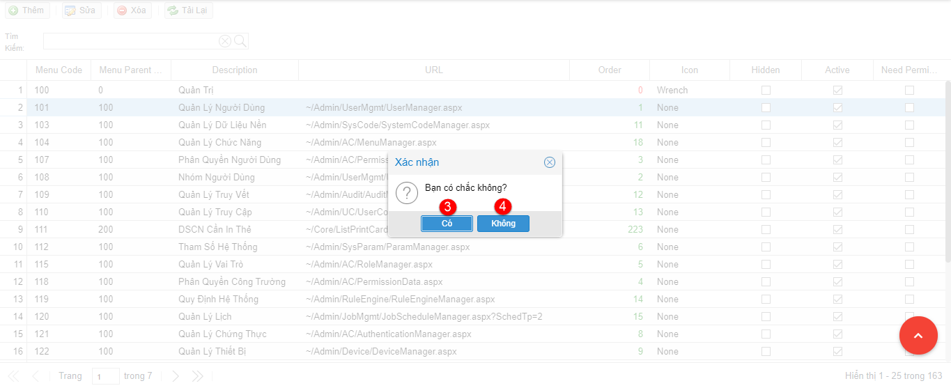 Sau khi nhấn vào Nút (2) Xóa thì hiển thị màn hình: