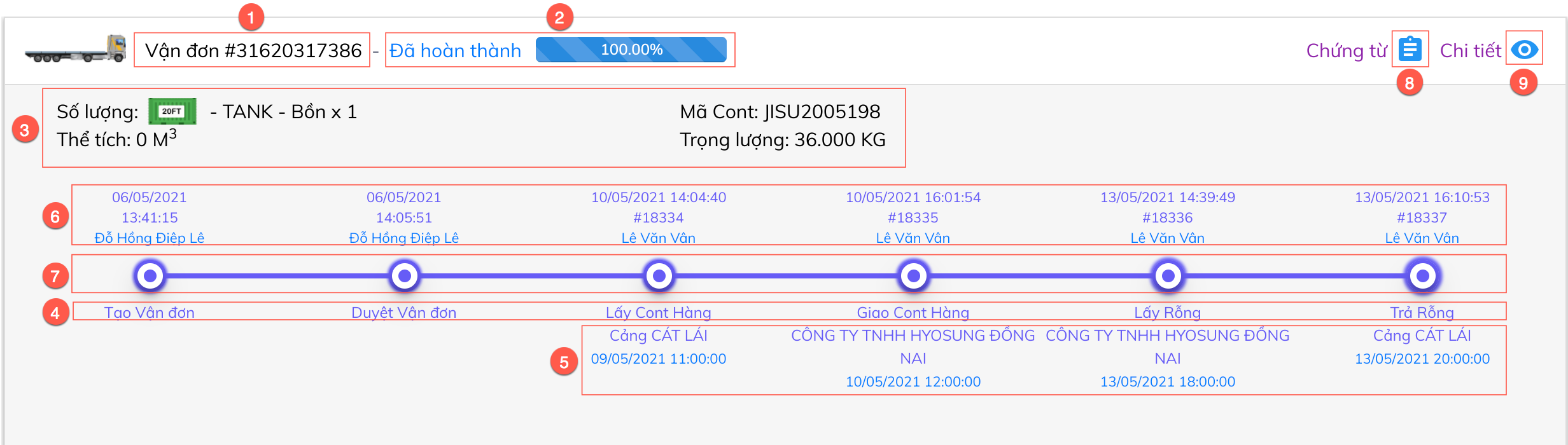 - (9): Nút Xem chi tiết thông tin và lộ trình thực hiện của vận đơn, màn hình thể hiện chi tiết: