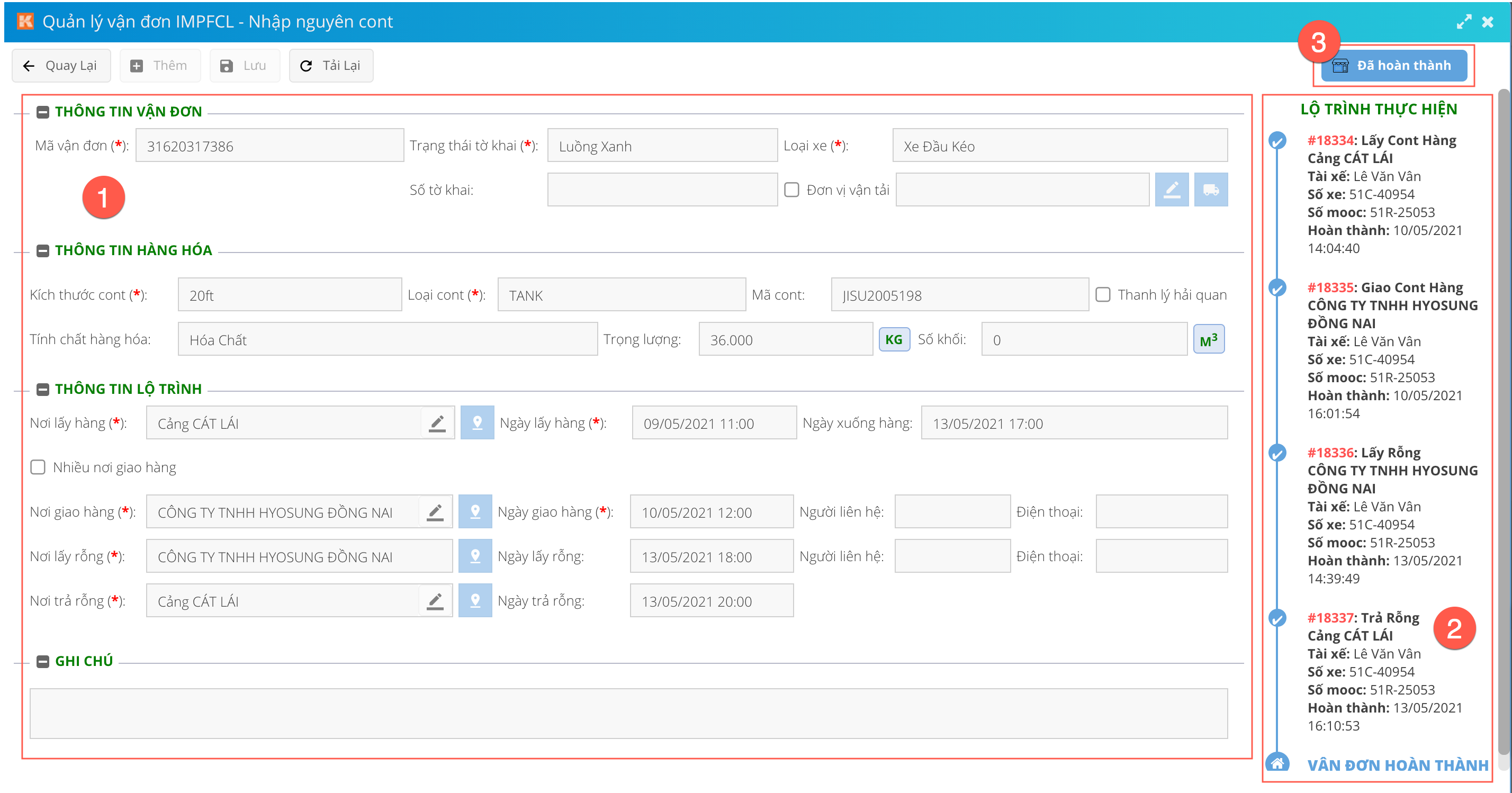 - (3): Thông tin về Loại cont, Mã số cont và Trọng lượng